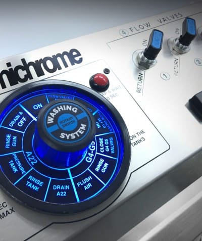 A patented lightweight electronic gun (e-Gun Select™) applies all the chemicals. Just press a button to go through the process sequence! This simplifies the plating process and makes it easier to learn. We also introduce these new features for this new system. Built-in Automated Washing System.
